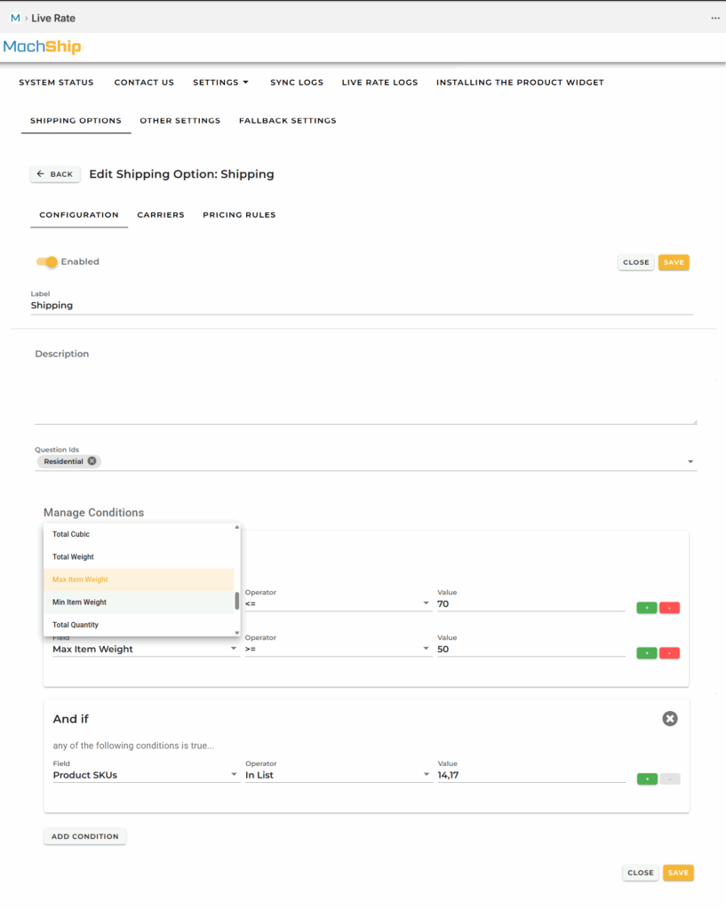These same configuration elements are used when creating or editing a Shipping Option, and within its Configuration, Carriers, and Pricing Rules sections. Here is a short explanation on each option you can find to use to set the conditions you want.
